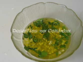 3. Numa taça colocar a cebola muito picada, os alhos igualmente picados e os coentros grosseiramente picados para manter o sabor. Adicionar o azeite, o vinagre, sal e pimenta. Envolver bem;