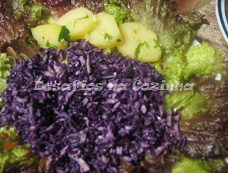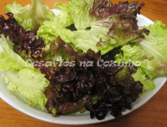 6. Num prato grande e de preferência com alguma profundidade, colocar a alface à volta do prato e a couve roxa no meio;