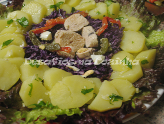 7. Colocar as batatas em volta da couve roxa e no meio, por cima da couve, dispor alternadamente as ovas, as tiras de pimento e os ovos partidos.