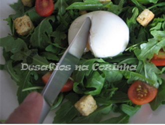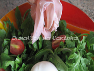 4. Deitar a rúcula num prato e juntar o tomate partido ao meio.