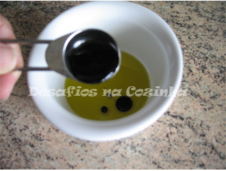 Fazer o vinagrete com 3 medidas de azeite para uma de vinagre balsâmico. Temperar com sal e pimenta e reservar;
