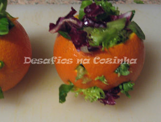 4. Temperar a salada e encher com ela as caixas de laranja. Puxar alguns pedaços de salada pelos orifícios.