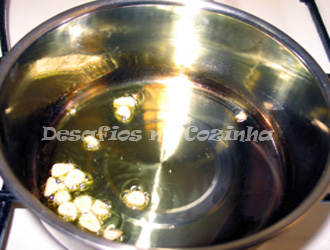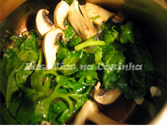 1. Numa frigideira alourei alho em fatias com azeite. Assim que o alho começou a estalar, sem fritar, deitei os espinafres e os cogumelos, mexendo sempre.
