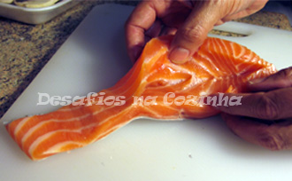 2. Com uma faca bem afiada, cortei o salmão transversalmente de forma a criar uma bolsa;