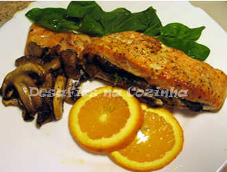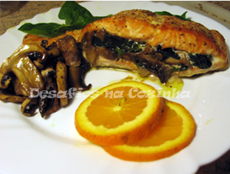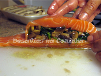 3. Dentro da bolsa do salmão acomodei o recheio de espinafres e cogumelos;