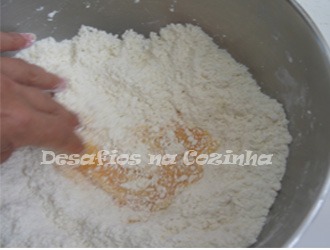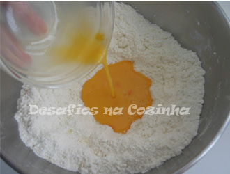 4. Abrir de novo um espaço no centro e deitar o ovo batido. Misturar de novo com os dedos sem apertar a massa;
