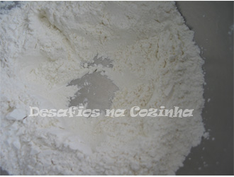 2. Misturar a farinha com o amido de milho, o fermento em pó, o açúcar e o sal.