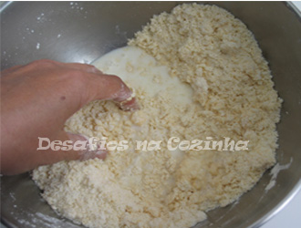 5. Deitar por fim o leite e misturar levemente, obtendo uma massa mole mas sem ser muito amassada;