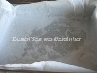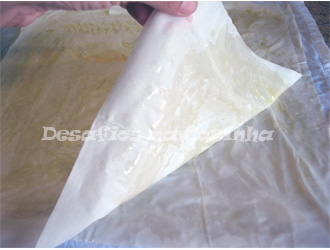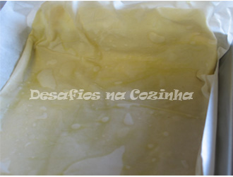 8. Na forma, estender as folhas de massa sobre o papel vegetal.