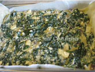 Deitar o recheio de espinafres e queijos por cima, uniformemente;