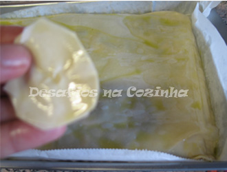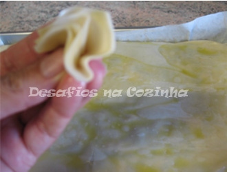 Se o tamanho das folhas for mais pequeno (habitualmente embalagem de 8 folhas), repetir o processo de pincelar com azeite e colocar folhas de massa até ter 4 folhas sobrepostas.