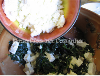 5. Quando os espinafres já estiverem à temperatura ambiente (ou quase) juntar o tomilho, o queijo feta, o requeijão e os ovos.