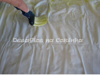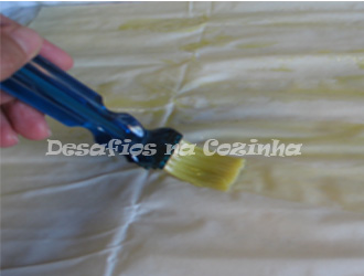 9. Com as restantes folhas, que se encontram entre os panos húmidos, repetir o processo: colocar uma folha, pincelar com azeite, colocar outra folha, etc, até ter uma placa de 4 folhas sobrepostas;
