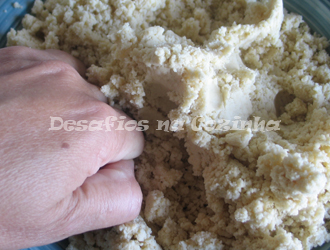 Se a massa estiver muito dura adicionar um pouco de água fria, mas mantendo sempre a massa com uma textura que permita amassar sem pegar às mãos.
