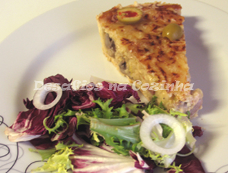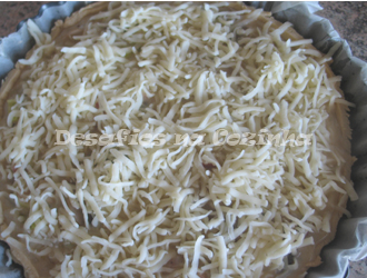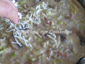 7. Deitar o recheio na forma de massa que se encontra na tarteira, polvilhar com queijo Mozarella e levar ao forno pré-aquecido a 180º, até apresentar um aspeto gratinado.