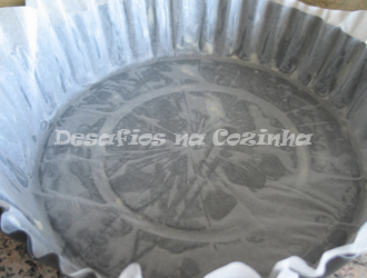 2. Forrar uma tarteira de fundo amovível com papel vegetal (ou untar com manteiga e polvilhar com farinha) e dispor a massa estendida de forma a forrar o seu fundo e lados.