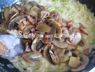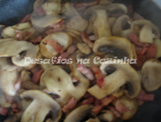 Juntar de seguida o bacon com os cogumelos e envolver.