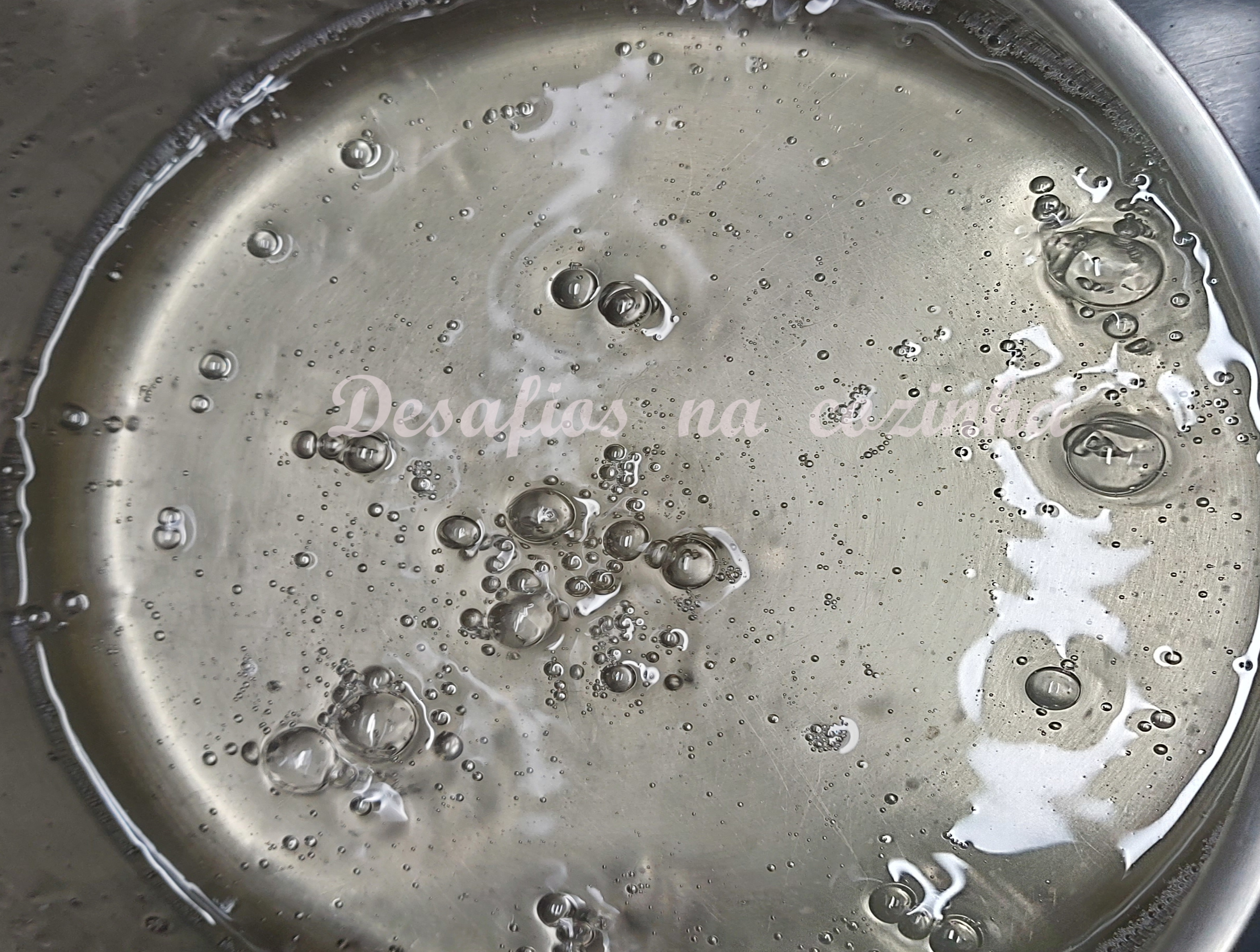 Juntar 500g de açúcar com os 200ml de água e levar ao lume para fazer uma calda em ponto de fio ligeiro (cerca de 5 minutos em lume médio). Quando atingir o ponto desejado, retirar do lume e deixar arrefecer.