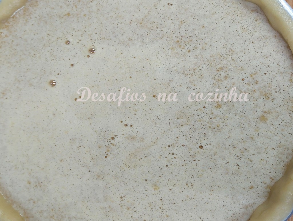 De seguida juntar todos os restantes ingredientes para a massa e triturar alternadamente com toques se for no processador, se for na bimby 15 segundos velocidade 5 ou sem equipamento amassar bem até formar uma massa homogénea. Se a massa estiver muito mole pode colocar uns minutos no frigorífico para ser mais fácil estender e forrar a forma que deve estar untada e polvilhada .