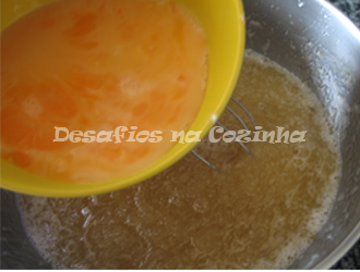 4. Verter a calda sobre o doce de gila, envolver bem e juntar os ovos e as gemas batidas;