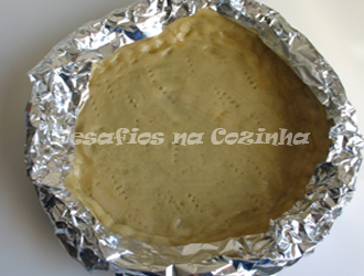 2. Depois da forma forrada com a massa, picá-la com um garfo, pincelar com ovo batido e tapar as bordas com papel de alumínio.