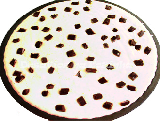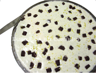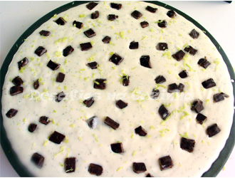 10. Cortar pedaços pequenos de 4 quadrados de chocolate after height e colocá-los por cima da tarte. Do alto deitar mais raspa de limão ( com “do alto” quero dizer que o limão deve ser raspado para cima da tarte a cerca de palmo e meio de altura, para as raspas cairem espalhadas e não em aglumerado).