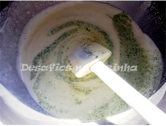 6. Deitar o leite condensado numa tigela e juntar a hortelã picada e passada por um passador;