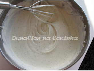 8. Bater as natas juntamente com uma colher de chá de açúcar. Juntar as natas batidas ao preparado de leite condensado e envolver bem;