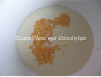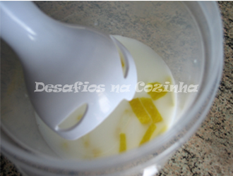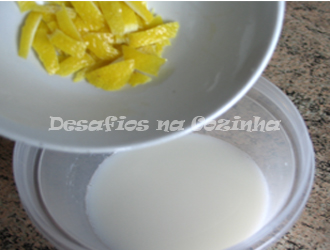 7. Dissolver o amido de milho no leite. Juntar a casca de limão partida em pedaços e bater com a batedeira.