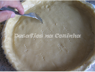 7. Picar a massa com um garfo e pincelar levemente com um pouco de ovo batido, retirado daqueles que batemos para o recheio.