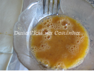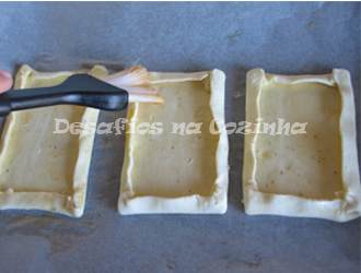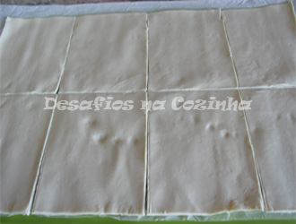 (Para ficar mais folhado pode ser utilizada o dobro da massa e sobrepor 2 retângulos de massa colados com um pouco de água pincelada entre eles)