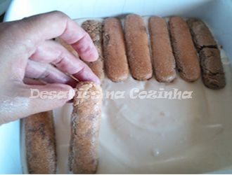 8. Colocar uma camada de creme no fundo do tabuleiro, aproximadamente metade da quantidade de creme que se fez, seguida de uma camada de palitos la reine demolhados no café;
