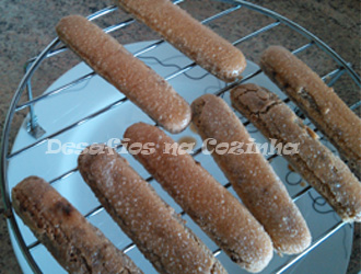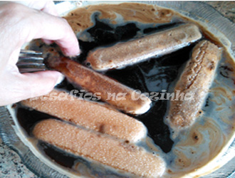 7. Passar os palitos por o café, deixando o tempo suficiente para ficarem molhados mas não desfeitos.