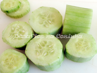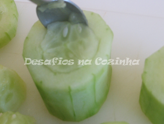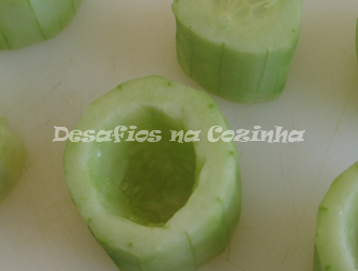 1. Cortar o pepino em fatias grossas e fazer uma cavidade no centro mas mantendo o fundo;