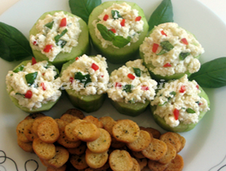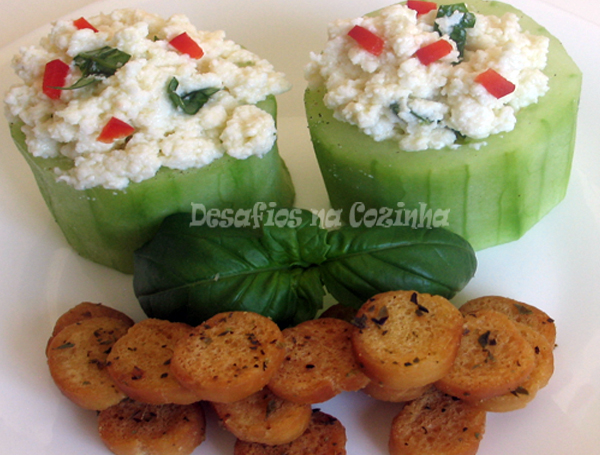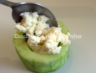6. Encher bem cada vaso de pepino com o recheio de requeijão.