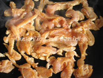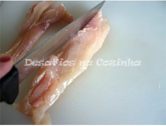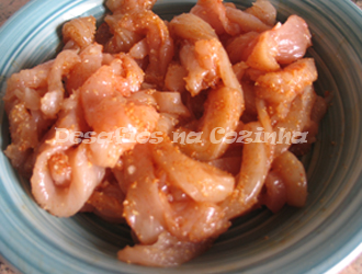 2. Cortar tiras de frango e temperar com uma mistura de óleo, sal, pimenta, alho em pó e paprika.