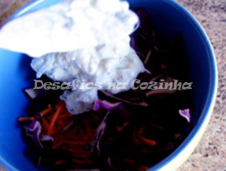 4. Numa tigela misturar a couve roxa, a cenoura e o molho de iogurte;